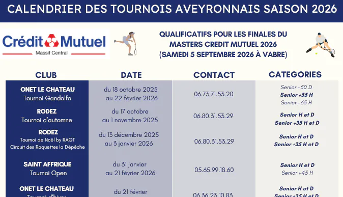 Le Comité Départemental de Tennis de l’Aveyron est fier de présenter son partenariat avec le Crédit Mutuel pour le Masters Crédit Mutuel.
