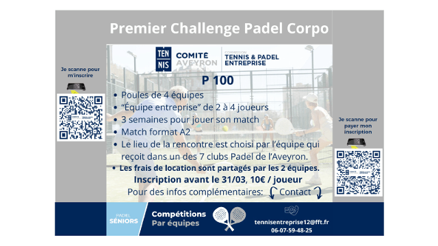 • Le challenge Padel Corpo comporte 3 étapes et il faudra donc procéder à l’inscription pour chacune des étapes.